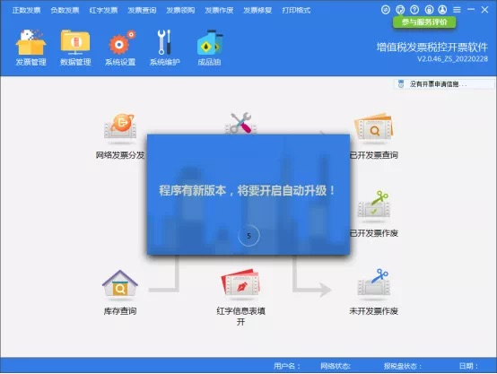 打开开票软件后系统自动弹出升级提示窗口,请您点击【开始升级】按钮,系统自动下载升级程序并启动安装,提示安装完成即可(注意:安装过程中自动检查原安装路径,建议您不要修改,修改后无法查看原开票系统数据)。
